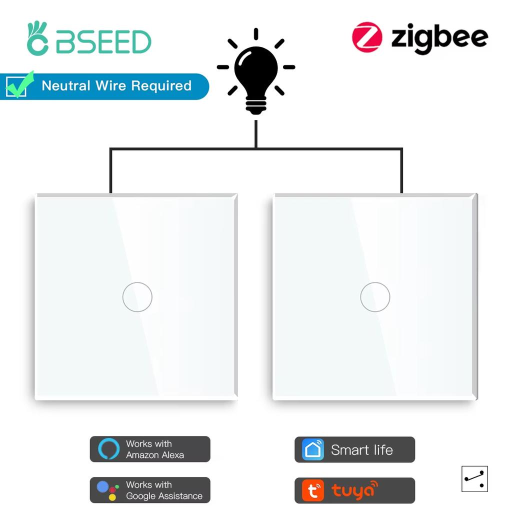 BSEED Zigbee Touch Switches 1Gang 2 Way Stair Switches Tuya Smart Glass Switches Google Smart Life Alexa Voice Control 2Pack