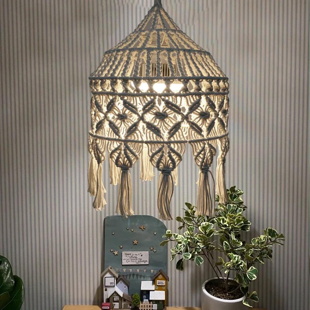 Bohemian Style Tapestry Lampshade Handmade Woven Cotton Tassel Macrame Wall Hanging Lamp Cover Ceiling Pendant for Room Decor