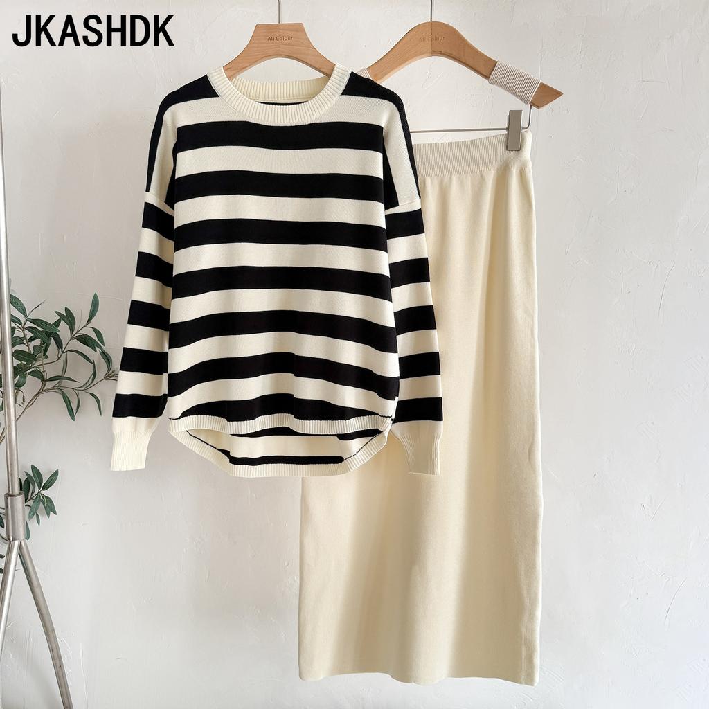 JKASHDK Women's Fashion Casual Spring Autumn Stripe Print Long Sleeve O-Neck Trousers Pants Suits
