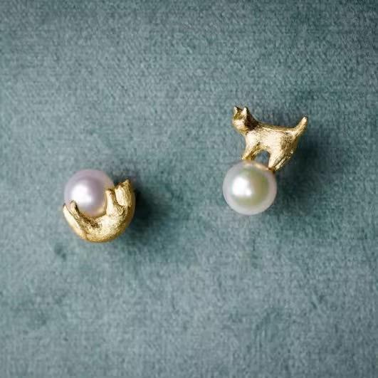 Original Matte Shiny Asymmetric Cute Earings Stud Vintage Fine Jewelry Light Luxury Daily Earing Pearl Cat Earrings For Women