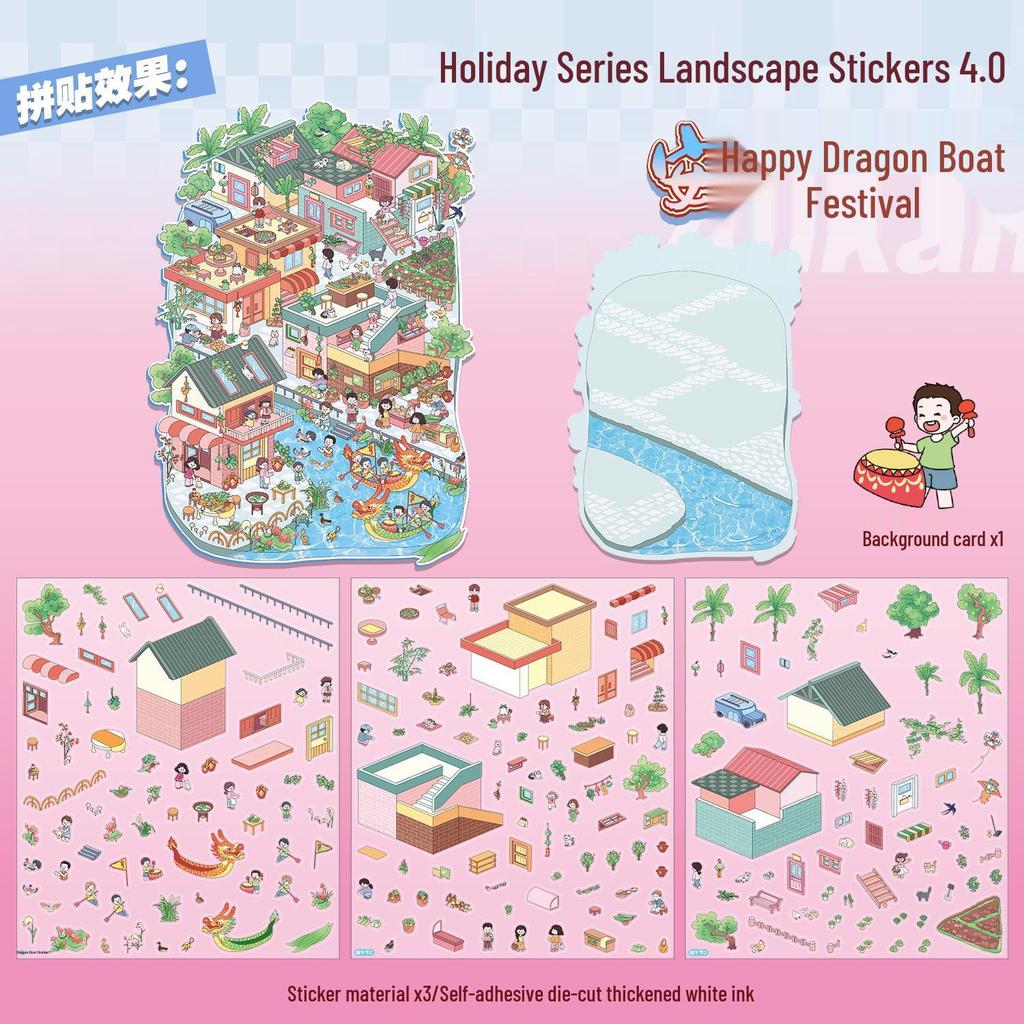Junbei 4.0 Festival Series Stickers: Large Sheet for National Day, Lantern Festival, New Year with Ancient Style Miniature Scene Toys for Girls.
