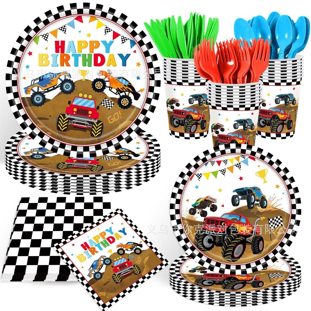Black and White Checkered Racing-themed Disposable Paper Plates and Cups for Children's Birthday Parties