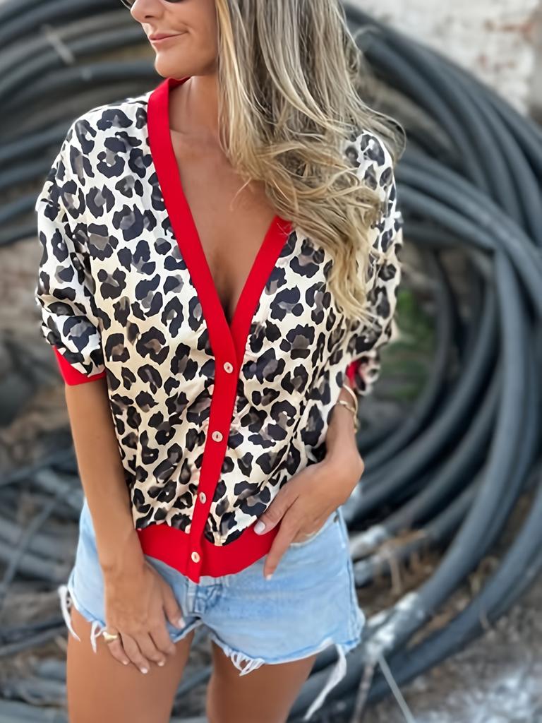 Women's Casual Leopard Print Color Blocked Edge Open-Front Metal Button Coat Jacket