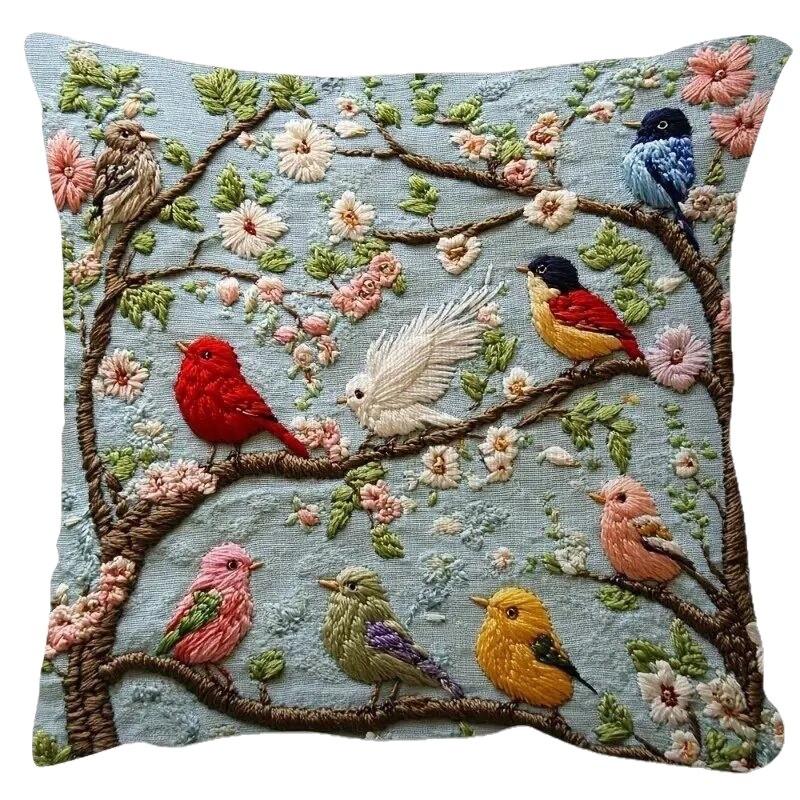 45cm Embroidered Pillow Cover with Colorful Birds and Floral Print for Living Room Decor
