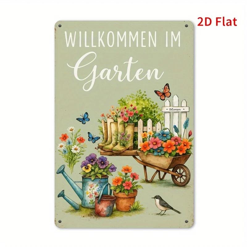 "Welcome To the Garden" Decorative Metal Sign In German - Charming Iron Wall Art with Floral and Bird Design, , Perfect for H