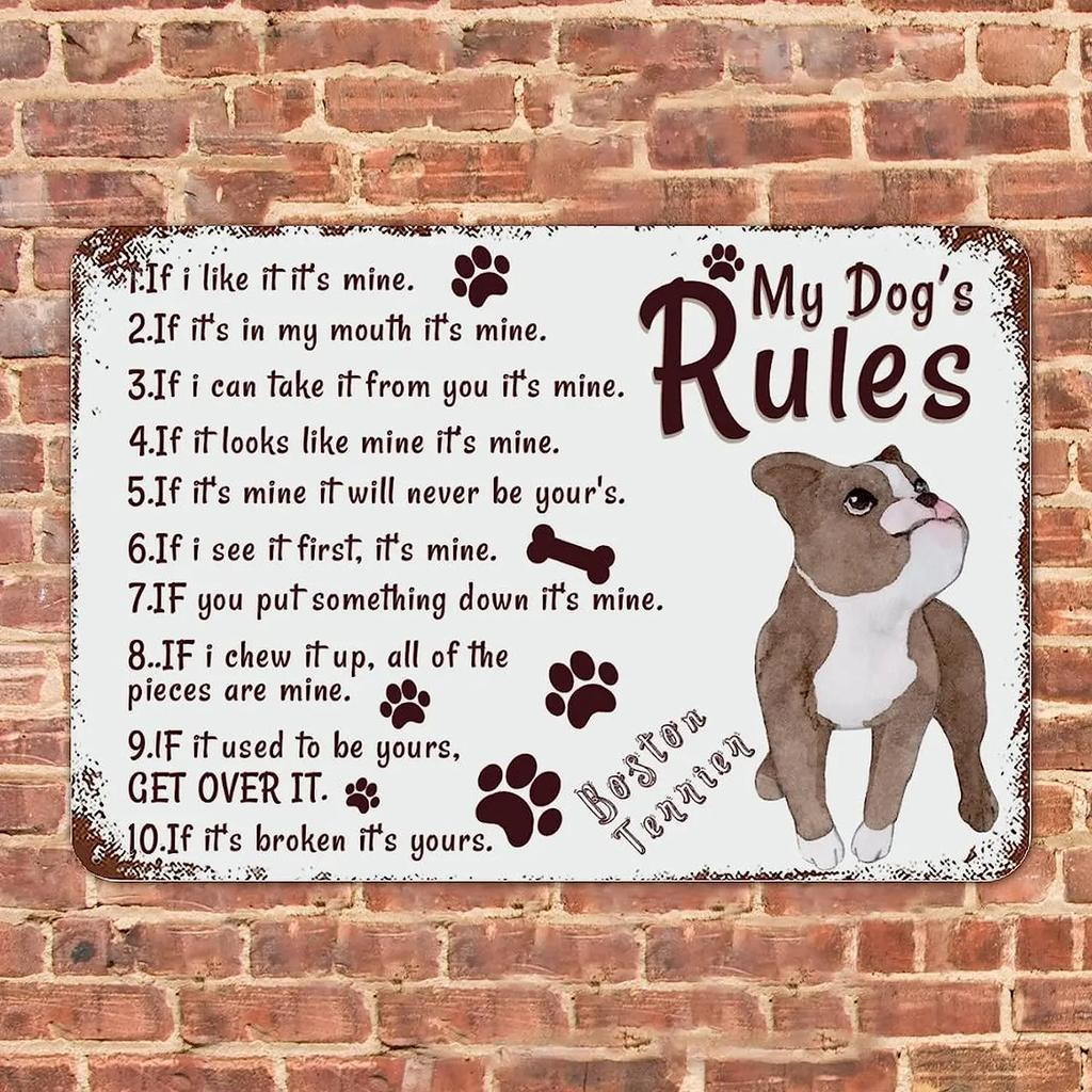 Boston Terrier Metal Tin Sign My Dog Rules Retro Metal Sign Funny Dog Gift for Dog Lovers Animal Paw Print Tin Sign Wall
