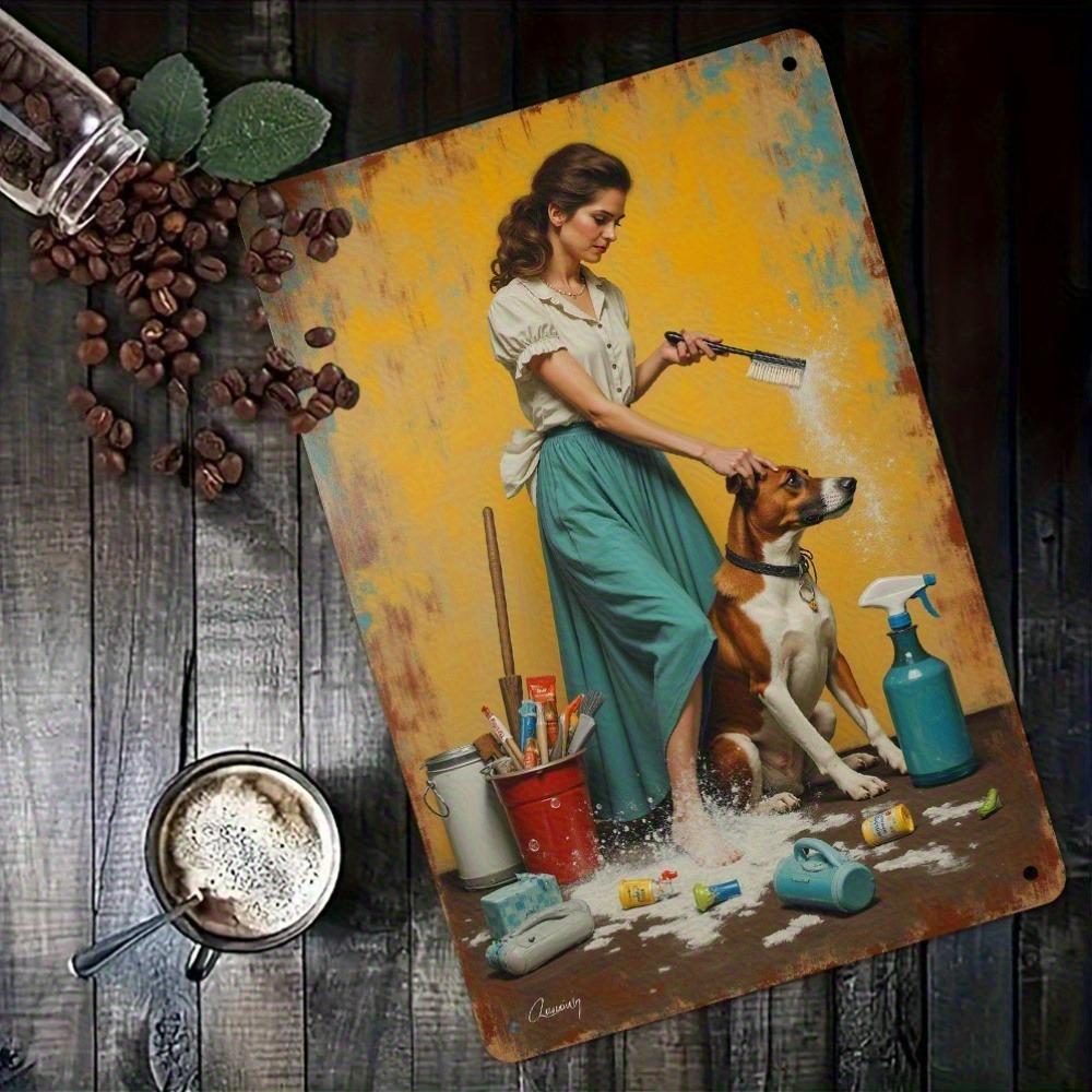 RetroBeautyDogMetalArt Retro Metal Wall Art 7.87x11.8" - "Beauty and Dog" Aluminum Panel, Woman Brushing Dog Decor for Home/Cafe