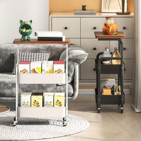 Crafted with a durable wood-grain tabletop and optional white or black storage baskets, its retro style complements various home decors. The carbon steel frame ensures strong load-bearing capacity, waterproofing, and easy cleaningperfect for humid environments. Compact and space-saving, this cart fits neatly beside sofas or under beds, making it an excellent solution for small apartments and narrow spaces.