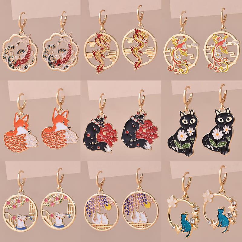 Colorful Aesthetic Animal Cat Rabbit Koi Dragon Earrings For Women Girls Enameled Delicate Gold Color Hoop Earrings Jewelry Gift