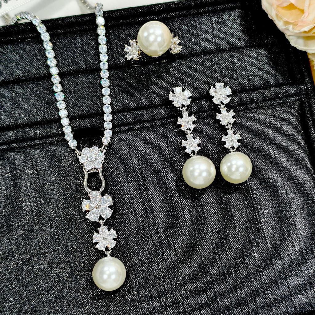 Luxury Natural Freshwater Pearl Bridal Jewelry Sets For Women Fashion Shiny Snowflake Zircon Earrings Necklace Ring Jewelry Gift