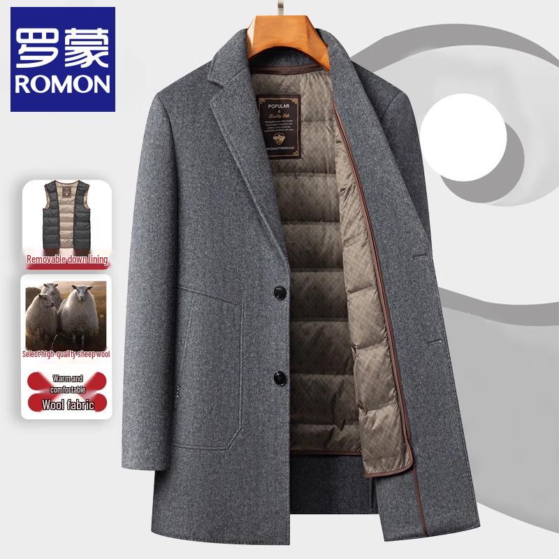 ROMON E Men's Mid-Length Wool Blend Overcoat with Down Liner