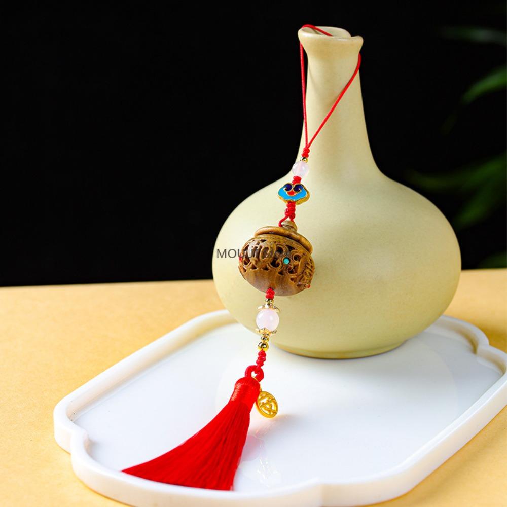 Green Ebony Wood Hollow Out Engraved Miniatures Incense Bag Portable Perfume Pendant Mobile Phone Decorative Wooden Accessorie
