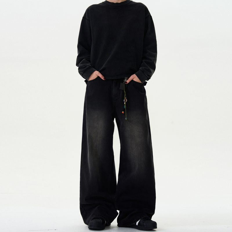 Madwitch Retro Washed Bootcut Denim Men's and Women's Loose Casual Wide Leg Straight Black Pants Ins