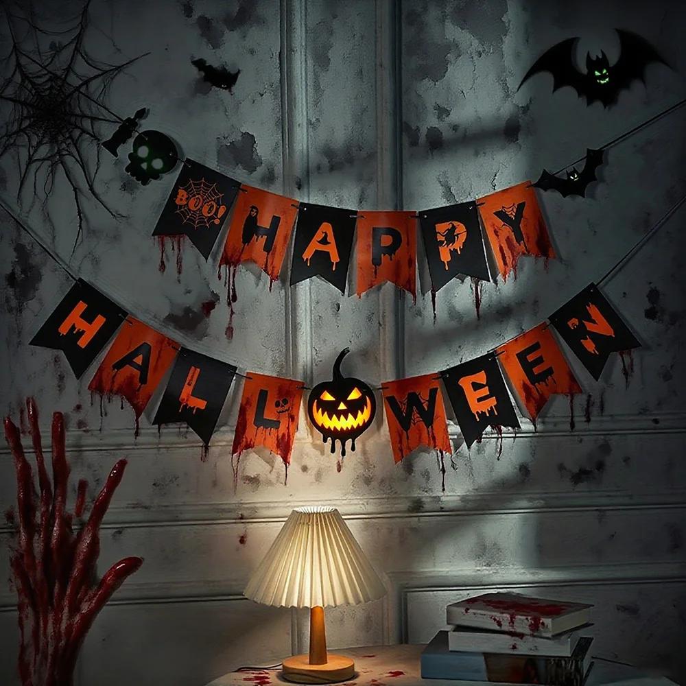 1/2pcs-Halloween Flag Hanging Ornaments-decorated with Ghost Bat Skeletons and Scary Pumpkins, Festive Decorations