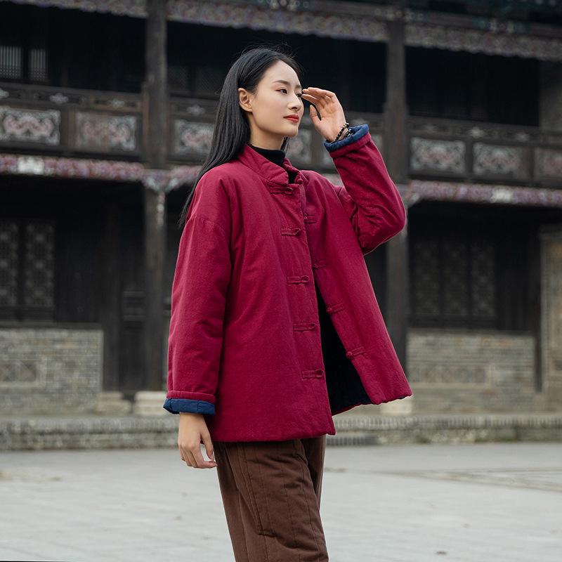 Winter Retro Chinese Cotton-Linen Women’s Coat - Solid Color, Stand Collar, Frog Button, Thickened Warm Jacket