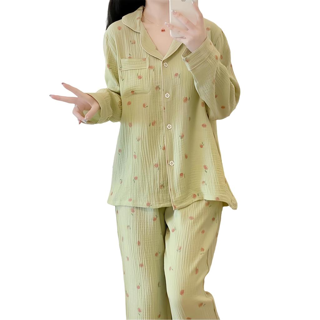 This two-piece cardigan set includes a long-sleeved shirt and long pants, making it easy to put on and take off and easy to coordinate. The long-sleeved and long-trouser style is especially suitable for spring, autumn, and winter, providing excellent warmth. The peach blossom pattern adds a lively and interesting touch to the overall design, showcasing the softness, beauty, and cuteness of a woman. At the same time, the relaxed fit gives the wearer an unparalleled sense of comfort and freedom.