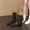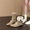 Cowhide Version Retro Denim Short Boots with Velvet Temperament Thick Heel and Thin Two Wear Belt Buckle Can Be Folded Women's Western Boots