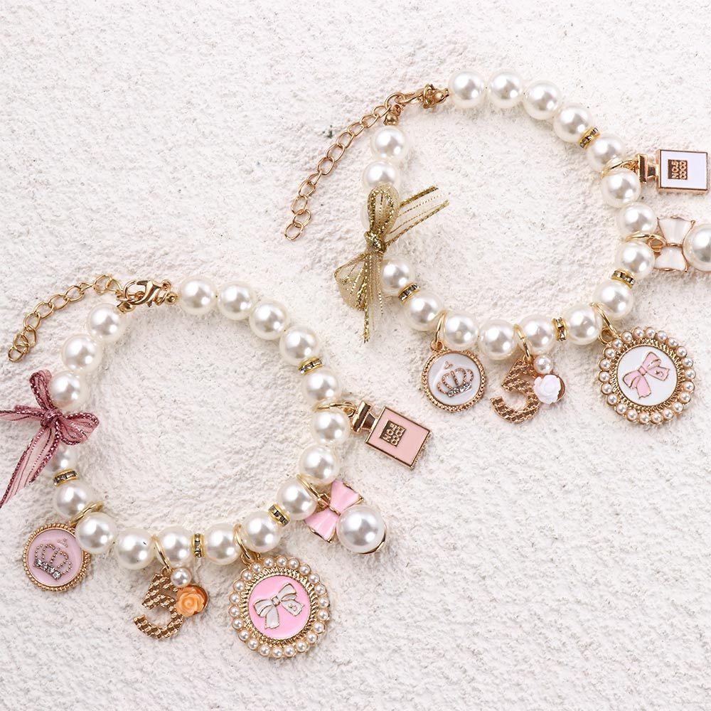 Pink Fashion Dog Chain Puppy Accessories Pearl Rhinestone Bow Collar Necklace Cat Jewelry Pet Collars