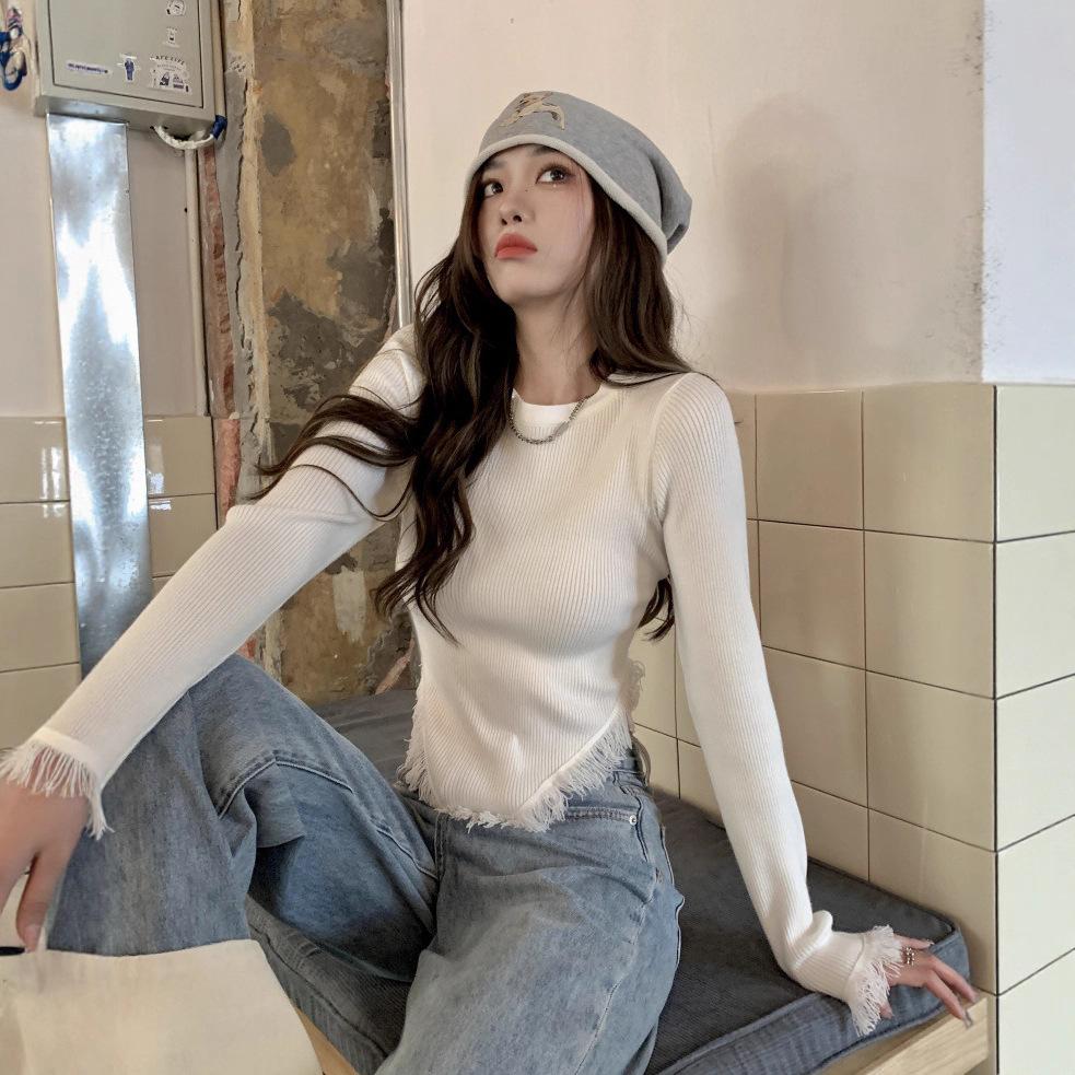 Foreign Style Long-sleeved Knitted Sweater Women's Autumn New Slim-fitting Fringed Rough Edge Irregular Short
