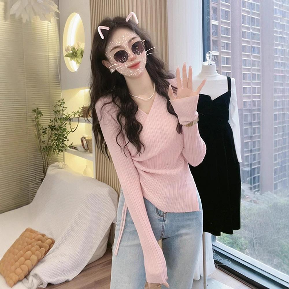 Autumn Pink V-neck Knitted Sweater Women's New Women's Clothing Slim-fit Irregular Long-sleeved Shirt