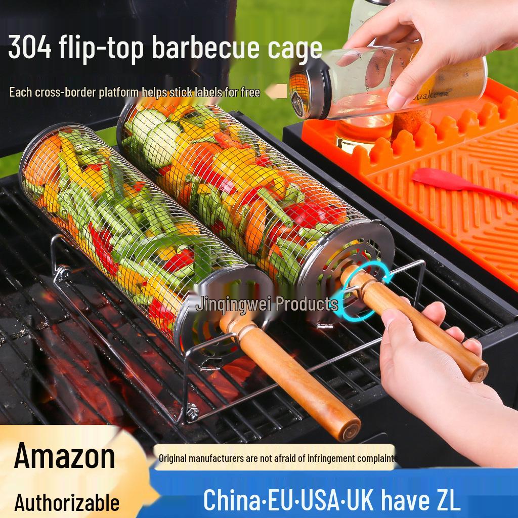 Rotating BBQ Grill Basket: 304 Stainless Steel with Wooden Handle