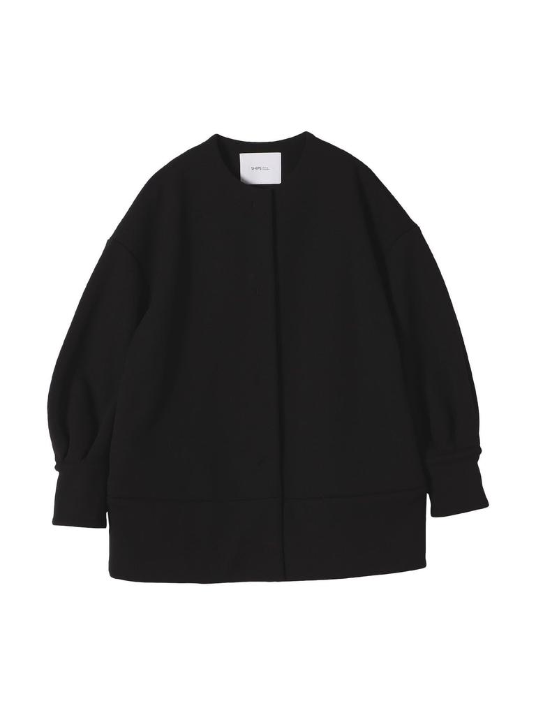 This collarless coat features a nuanced cocoon silhouette for a feminine look.