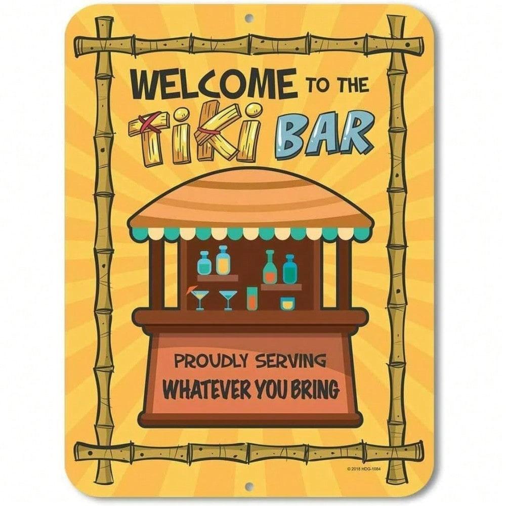 Vintage Tropical-Centric Metal Sign, "Welcome To the Tiki Bar" Humorous Design, Bar Man Cave Decor Statement Accent
