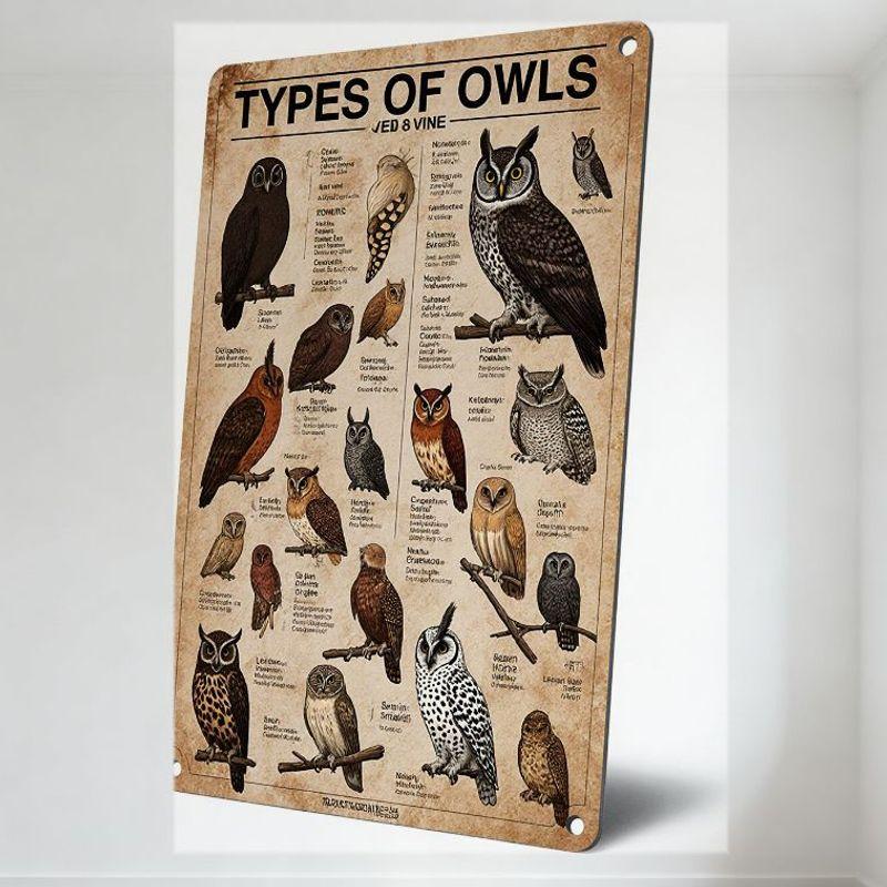 Vintage 'Types of Owls' Metal Sign with JED & VINE, Great Horned/Barn/Screech Owl Illustrations, Rustic Antique Hanging Tin Wall