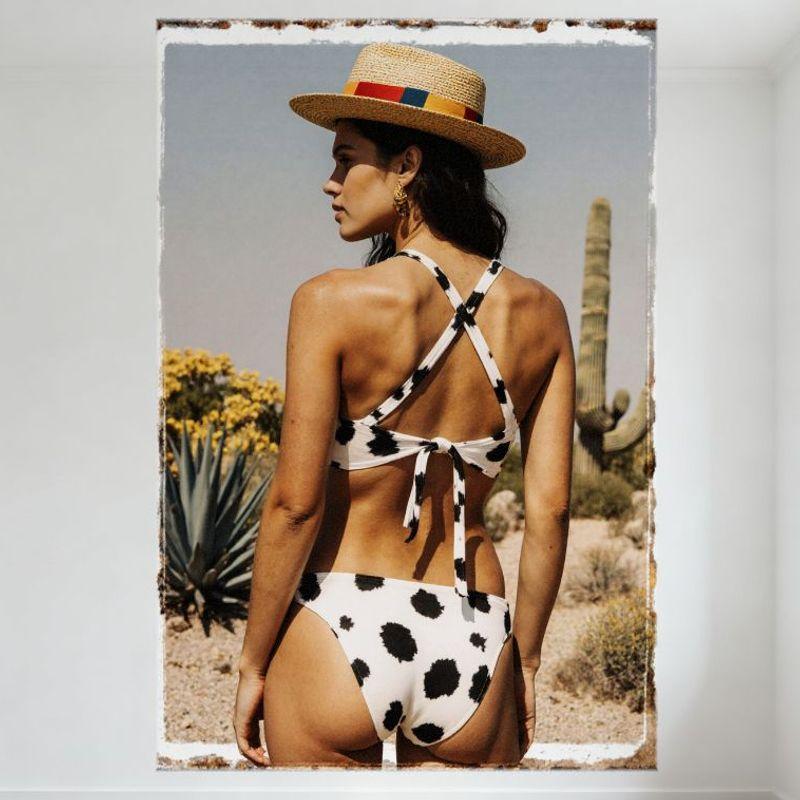 Sexy Woman In Desert Vintage Distressed Tin Sign Metal Poster - White Cow - Print Bikini, Straw Hat, Saguaro Cactus Background W