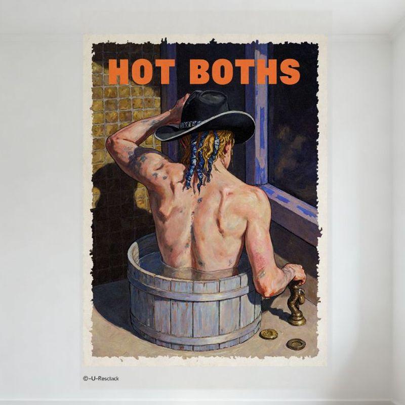 Sexy Shirtless Man with Blue Braids & Tattoos In Wooden Barrel Hot Tub - Retro Vintage Style Tin Sign for Wall Decor