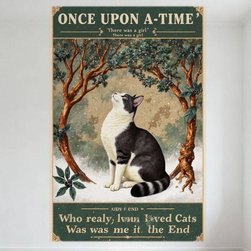Vintage Once Upon a Time Fairy Tale Metal Sign, Black White Cat with Striped Tail, Winter Snowy Scene Tin Poster for Home Bar Ca