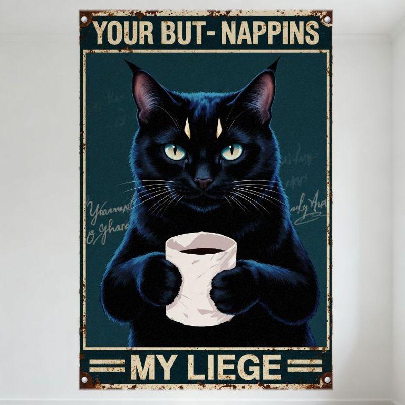 Vintage Teal Background Metal Sign with Black Cat Holding Mug 'YOUR BUT-NAPPINS MY LIEGE' Rustic Aged Wall Decor for Bar Pub Hom