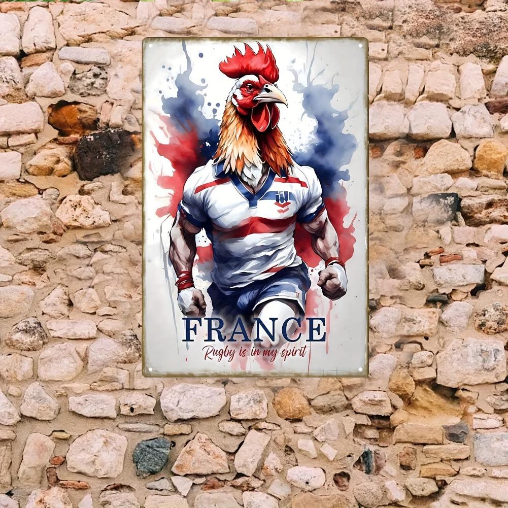 2D Flat, 1pc Vintage French Rugby Metal Wall Art Sign - 8x12 Inch Iron Rooster In France Jersey with Graffiti Background