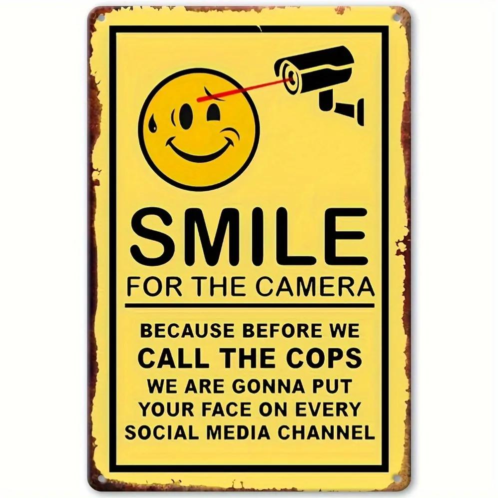 French "Smile, You're On Camera" Metal Security Sign – Wall-Mounted Surveillance Warning Hanging Decor