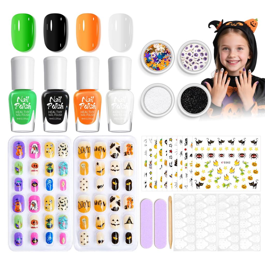 Set Contents: 4-Color Peel-Off Nail Polishes, 4 Glitter Decorations, 48 Halloween False Nails, 2 Nail Polishes + False Nail Adhesive, 3 Halloween Decorative Stickers.
