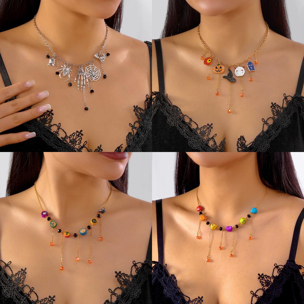 Halloween Pottery Pumpkin Ghost Witch Hat Fringed Alloy Pendant Necklace Skeleton Hand Spider Simple Necklace