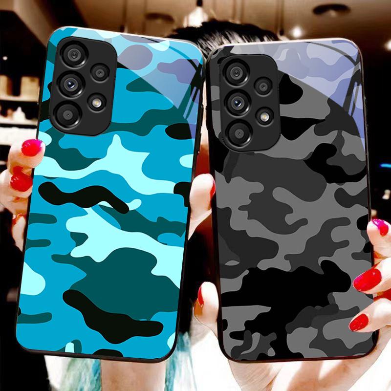 Camouflage Blue For Samsung Galaxy S10 20 Plus 21 FE 22 23 24 FE 25 Ultra Black Tempered Glass Phone Case Hard Shell
