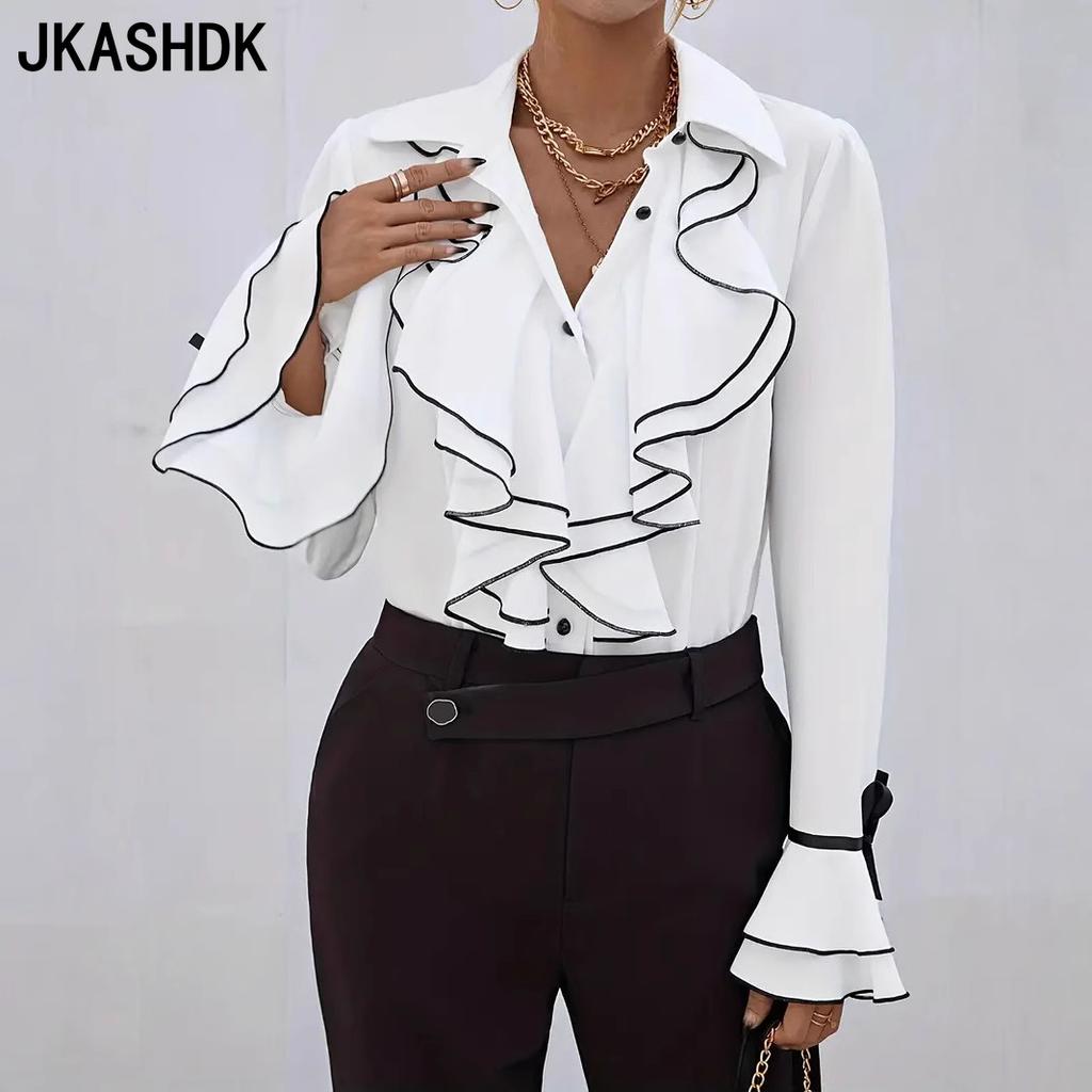 JKASHDK Women's Fashion Casual Spring Autumn Stripe Print Long Sleeve POLO Neck Blouses & Shirts