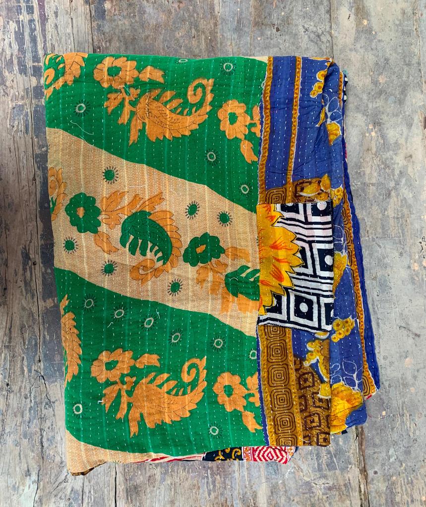 Wrap yourself in the beauty of tradition with this vibrant handmade Indian Gudari quilt, crafted from layers of upcycled cotton saris. Also known as a Kantha quilt.