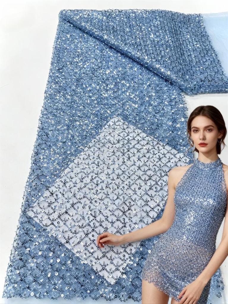 Sky Blue African Sequins Lace Fabric 2025 High Quality Lace Embroidery Nigerian Mesh Beads Fabric French For Wedding Party Dress