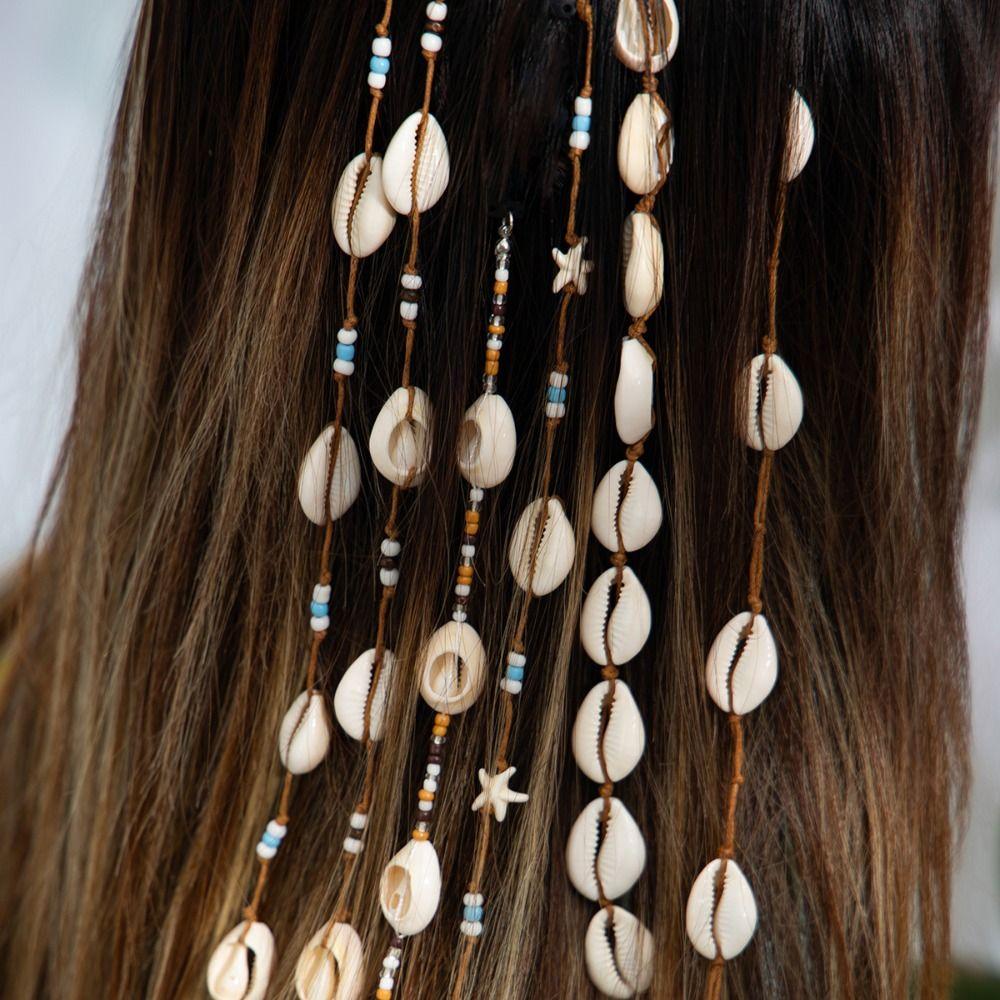 Featuring a trendy geometric pattern, these conch tassel hair accessories add a stylish touch to any summer beach look.