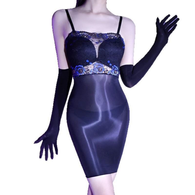 Women Sexy Dress Oil Shiny Transparent Hip Skirt Tight Lace Floral Top Tightdress Silky Slippery Ultra-Thin Seductive Lingerie