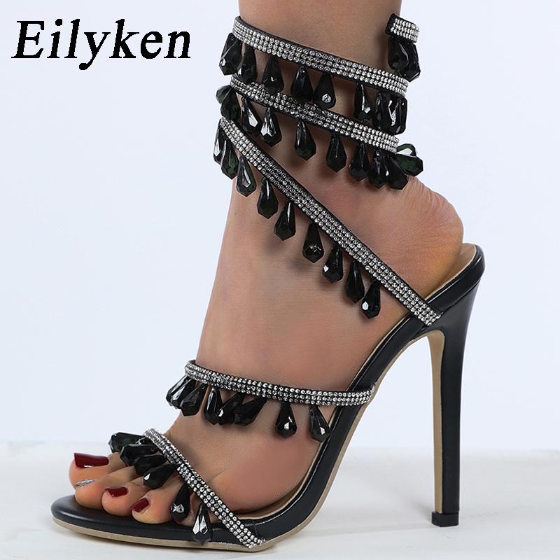 Fashion Eilyken Summer Fashion Rhinestone Crystal Sandals Women's String Bead Banquet Stiletto High Heel Wrap Strap Open Toed Shoes