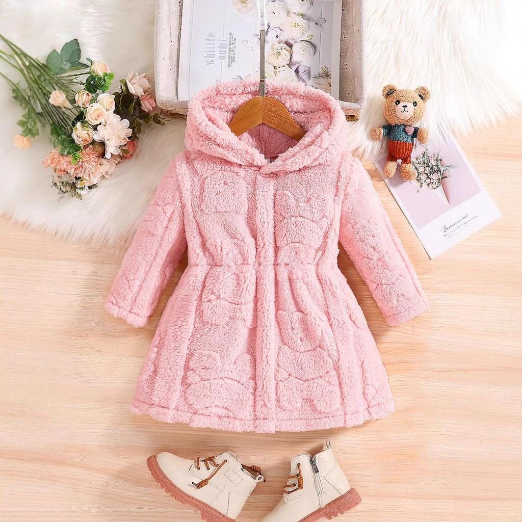 This adorable hooded cardigan jacket is perfect for keeping your little girl cozy and stylish during the colder months. Crafted from high-quality polyester material, it provides excellent warmth and comfort. The long sleeves add an extra layer of warmth, making it ideal for winter wear. With its charming teddy bear flannel design, this versatile jacket is perfect for casual outings and adds a cute touch to any outfit. Whether for a day at the park or a family gathering, this warm jacket is a delightful addition to your child's wardrobe.