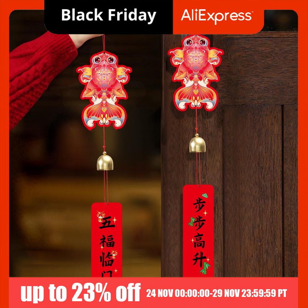 1 Pair Blessings Printing Spring Festival Potted Plant Pendant Traditional Not Easy To Fade Doorknob Wind Chimes With Bell