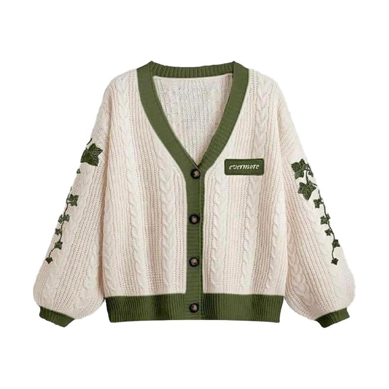 Fall Winter Vintage Outfit Cardigan Green Vine Embroidered Button Down Cable Knit Lantern Sleeve Sweater Loose Casual Woolen Cardigan Jacket