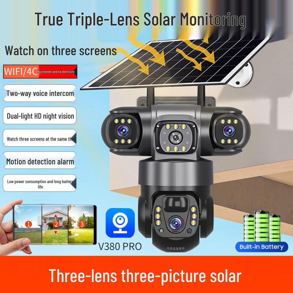 V380 Solar 4G Wireless HD Night Vision WiFi PTZ Battery Camera with Three Lenses