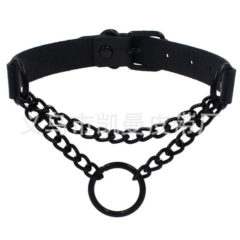Punk Style Dark Leather Round Ring Choker Necklace - Black Chain Clavicle Neckband