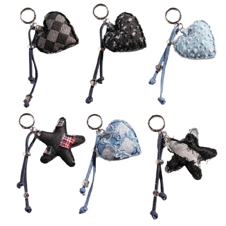 Adorable cartoon styles denims keychain featuring a heart shaped design with whimsical charm, crafted from sturdy cotton fabric for long lasting daily use as both functional key organizers and stylish bag accessory.