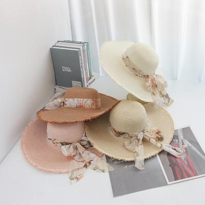 Summer Lace Bow Streamer Straw Hat Women's Vacation Seaside Beach Hat Flat Top Straw Top Hat Sunscreen Sunshade Grass